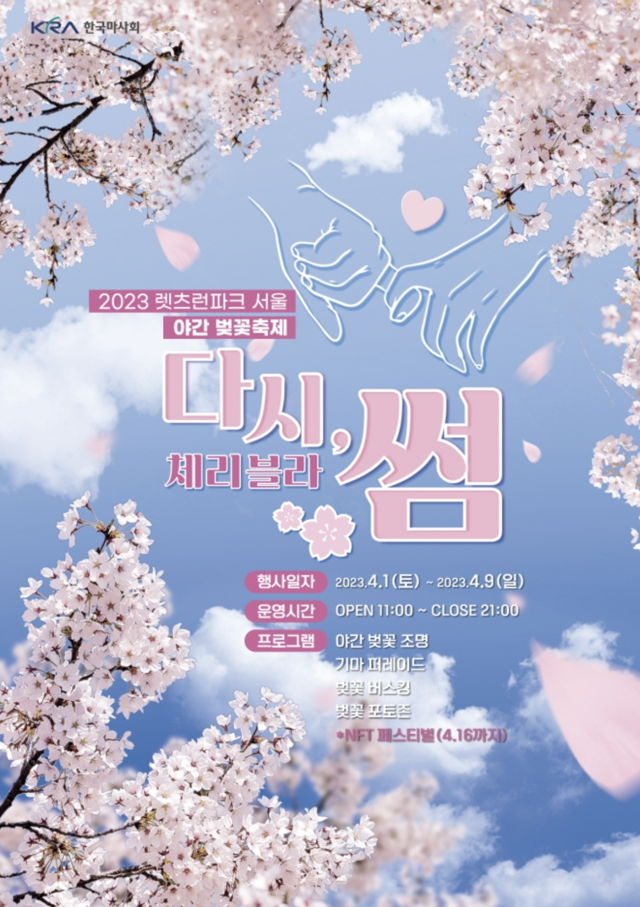 오랜만에 봄꽃축제를 찾은 시민들을 반갑게 맞이하는 '시민 맞이 개막행사' 매일 저녁 다양한 공연이 펼쳐지는 '봄꽃나잇' 공예품과 친환경 제품을 만날 수 있는 '아트마켓' 다양한 먹거리가 준비된 '푸드마켓' 벚꽃길의 즐거움을 더해주는 '버스킹' 직접 보고 생생하게 경험해 보는 '전시 및 체험' 서울마리나리조트와 함께하는 '요트투어' 등 다채로운 볼거리, 먹거리, 즐길거리가 펼쳐진다고 합니다.3. 렛츠런파크 서울 야간벚꽃축제기간: 2023.04.01(토)~2023.04.09(일)시간: 11:00~21:00장소: 렛츠런파크서울요금: 무료